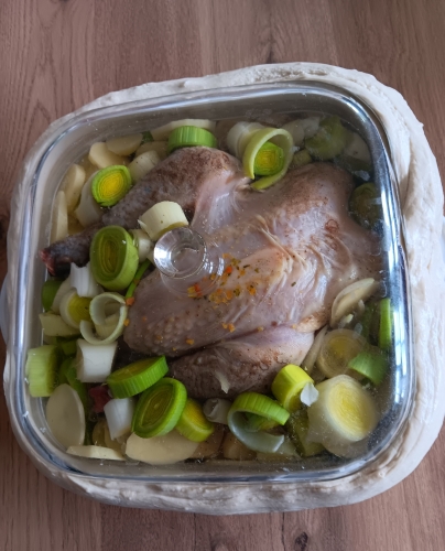 Nettoyer les légumes et les couper en rondelles. Déposer le tout dans le plat, verser le vin blanc, le bouillon, saler et poivrer. Poser le poulet, mettre le couvercle puis fermer hermétiquement l'espace entre le plat et le couvercle à l'aide de la pâte.