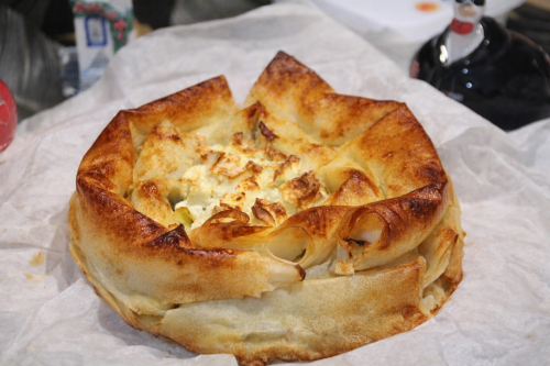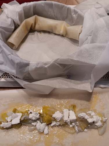Déposer au centre le reste de poireaux et de Feta émiettée.